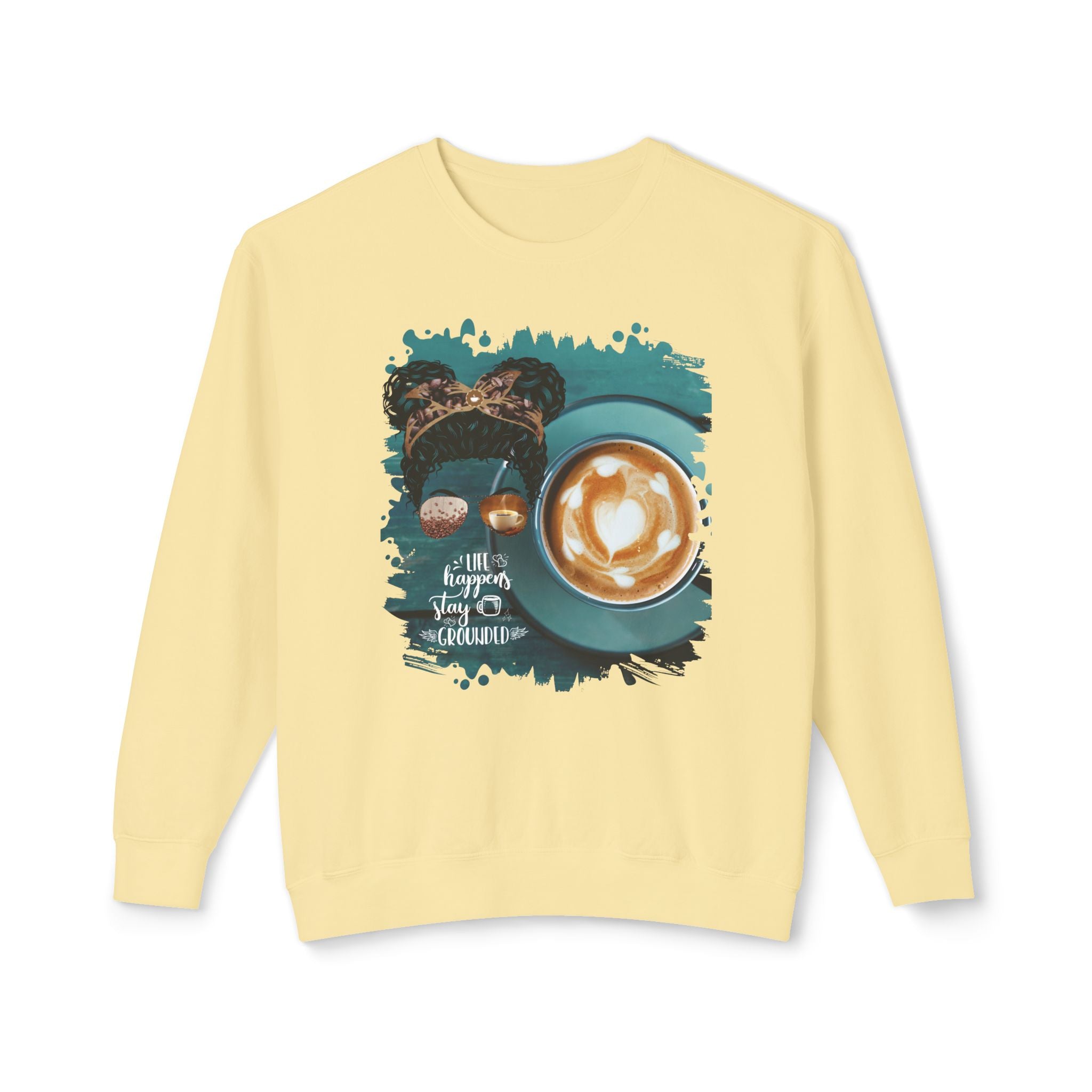 Stay Grounded, Coffee Cup, Black Hair Messy Bun, Unisex Lightweight Crewneck Sweatshirt
