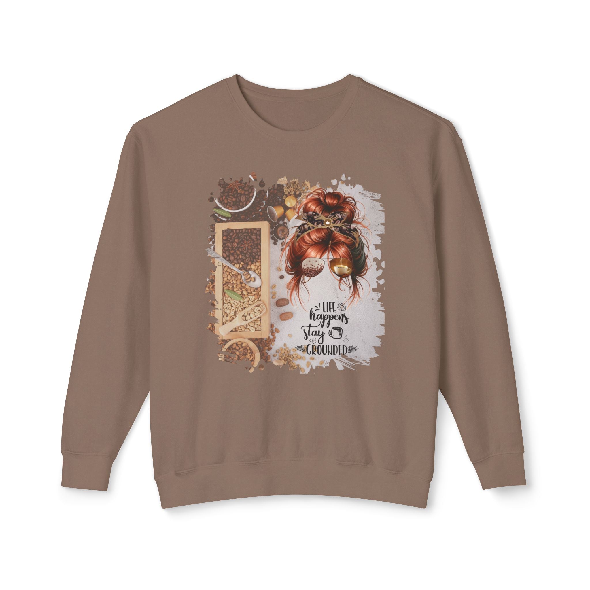 Stay Grounded, Coffee Beans Variety, Red Hair Messy Bun, Unisex Lightweight Crewneck Sweatshirt